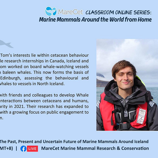 Join us on 4 September 2021 (Saturday) at 6:00 p.m. (GMT+8) for a FB LIVE sharing on #marinemammals in Iceland by Tom Grove from @WhaleWiseLive! Don't forget to tune in! #marecet #talks #webinar #Iceland