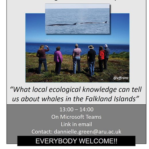Join us next Friday 20th Nov at 13:00 UK time our Biology seminar with Veronica Frans on using local ecological knowledge to understand whales in the Falklands. Message me for Teams link! @VFFrans @FI_Conservation @CCI_Cambridge @GSI_ARU @ARU_Biology @ZoologyMuseum @CCF_Tweets
